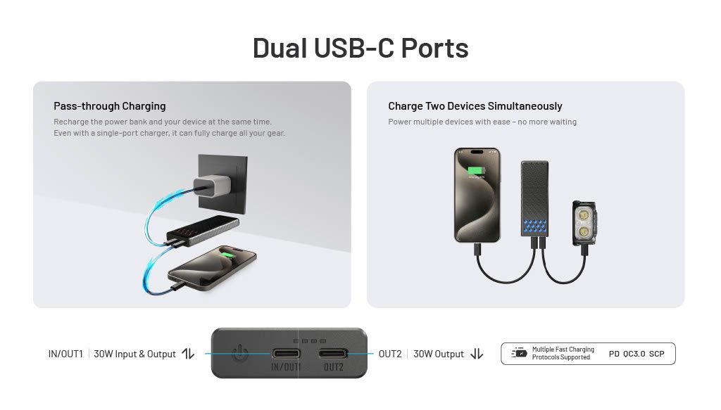 Outdoorliefhebbers, trailrunners, reisavonturiers en iedereen die een krachtige, compacte en waterdichte powerbank zoekt om onderweg meerdere apparaten veilig en snel op te laden — zelfs in ruige of natte omstandigheden.