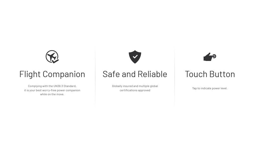 - Uitgangen (USB-C OUT1 / OUT2): 5 V⎓3 A / 9 V⎓3 A / 12 V⎓2.5 A / 15 V⎓2 A / 10 V⎓2.25 A (max 30 W)